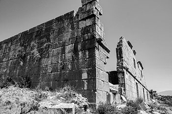 Her bir mekânın dışarıya açılan kapıları olduğu gibi, birbirleri arasında da geçiş sağlayan kapıları bulunmaktadır. Yapının dış duvarlarında isodomik (eş boyutlu taş bloklarla yapılan) örgü tekniği, iç duvarlarında ise poligonal (çokgen taşlarla yapılan) örgü tekniği kullanılmıştır. Doğudaki stoa içinde yer alan, 2 metre yüksekliğe sahip kapılar yapıya giriş sağlarken, bu tasarım hem güvenliği hem de kullanım kolaylığını gözetmiştir.